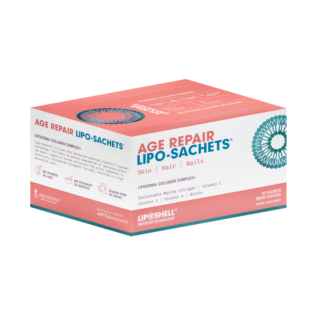 With this enhanced absorption, Age Repair Lipo-Sachets support healthy skin, hair and nails, including: