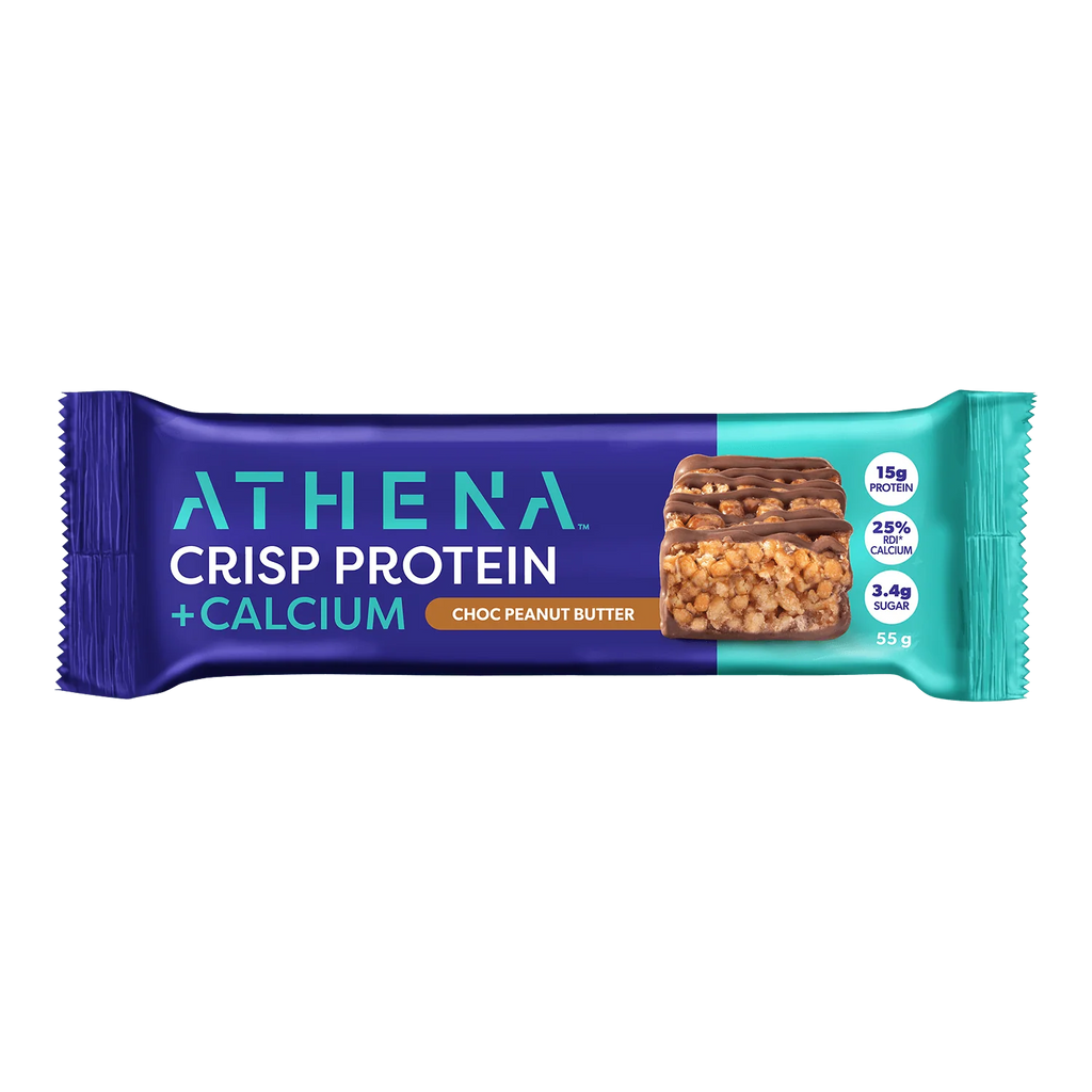 Athena Crisp Protein + Calcium Bars - Choc Peanut Butter is a tasty light and crispy bar containing 15g of protein, 25% of your RDI* of calcium, drizzled in no added sugar chocolate.