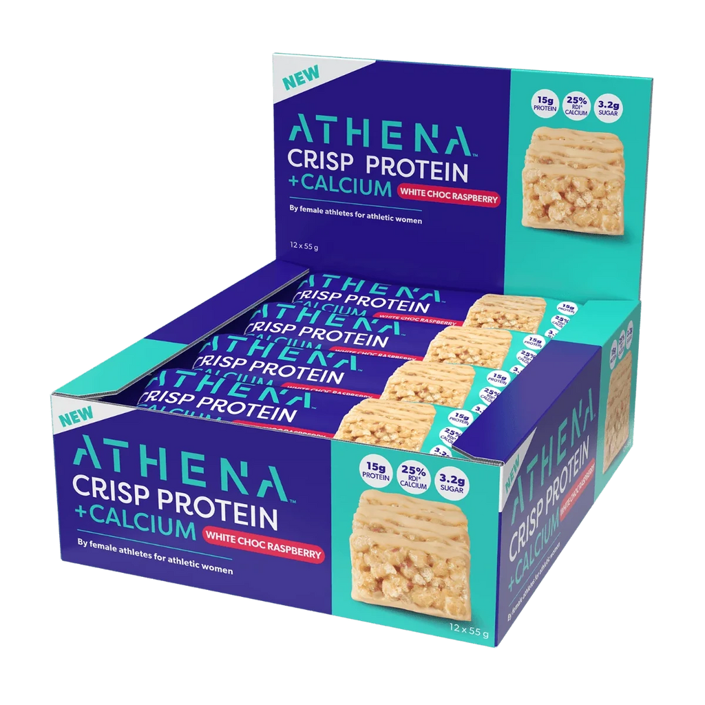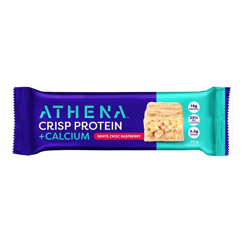 Athena Crisp Protein + Calcium Bars - White Choc Raspberry is a tasty light and crispy bar containing 15g of protein, 25% of your RDI* of calcium, drizzled in no added sugar chocolate.