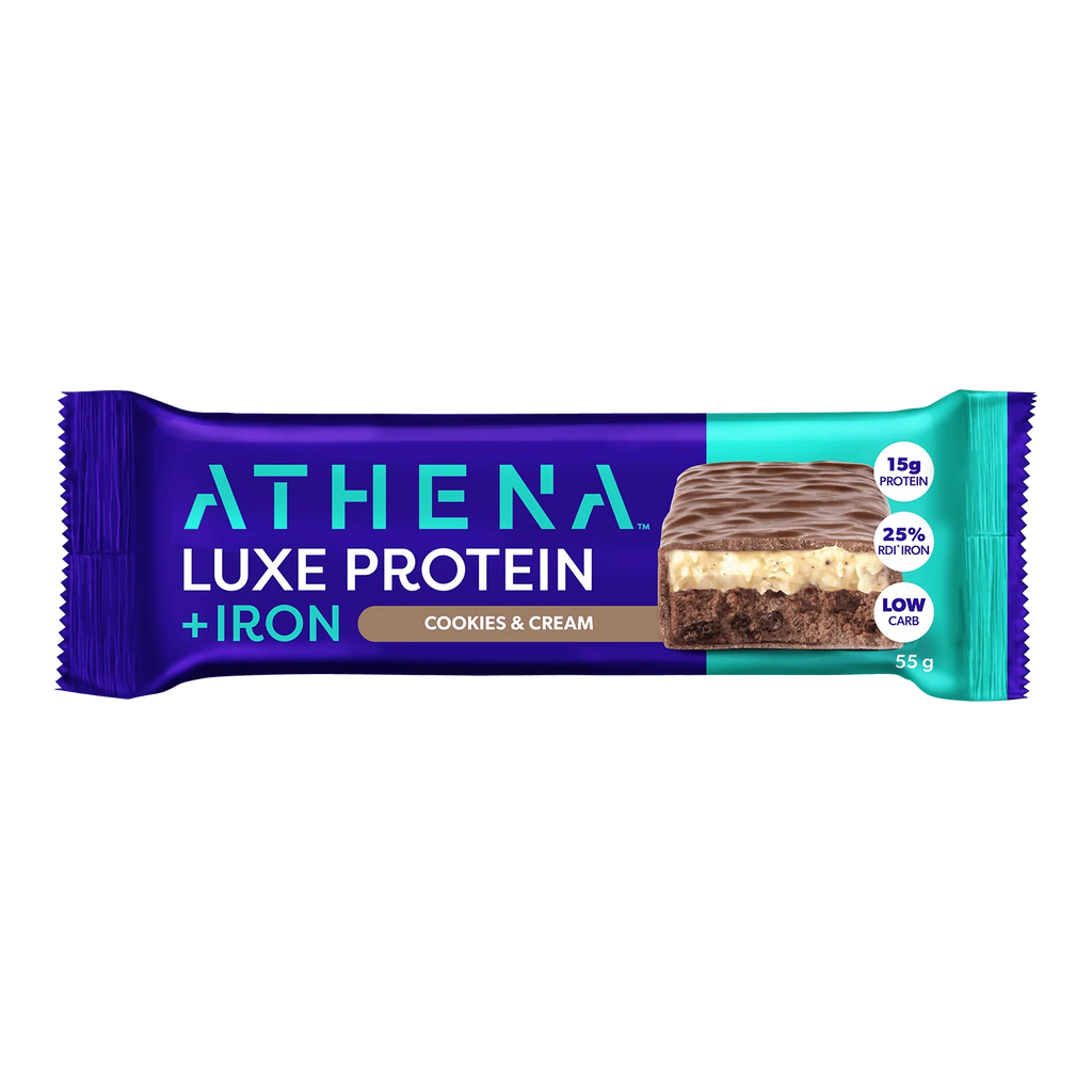 Athena Luxe Protein + Iron Bars - Cookies & Cream is an indulgent multi-layer bar with a creamy Luxe layer, coated in delicious no added sugar milk chocolate. It's the perfect convenient protein snack on the go.