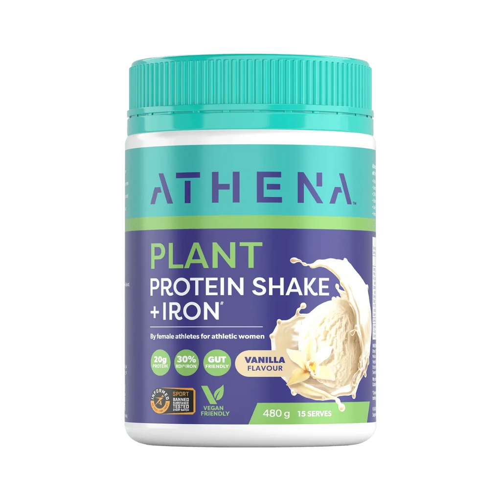 Athena Plant Protein Shake + Iron - Vanilla Flavour is a vegan friendly protein blend with Iron and Digestive Enzymes to support your sports nutrition needs.
