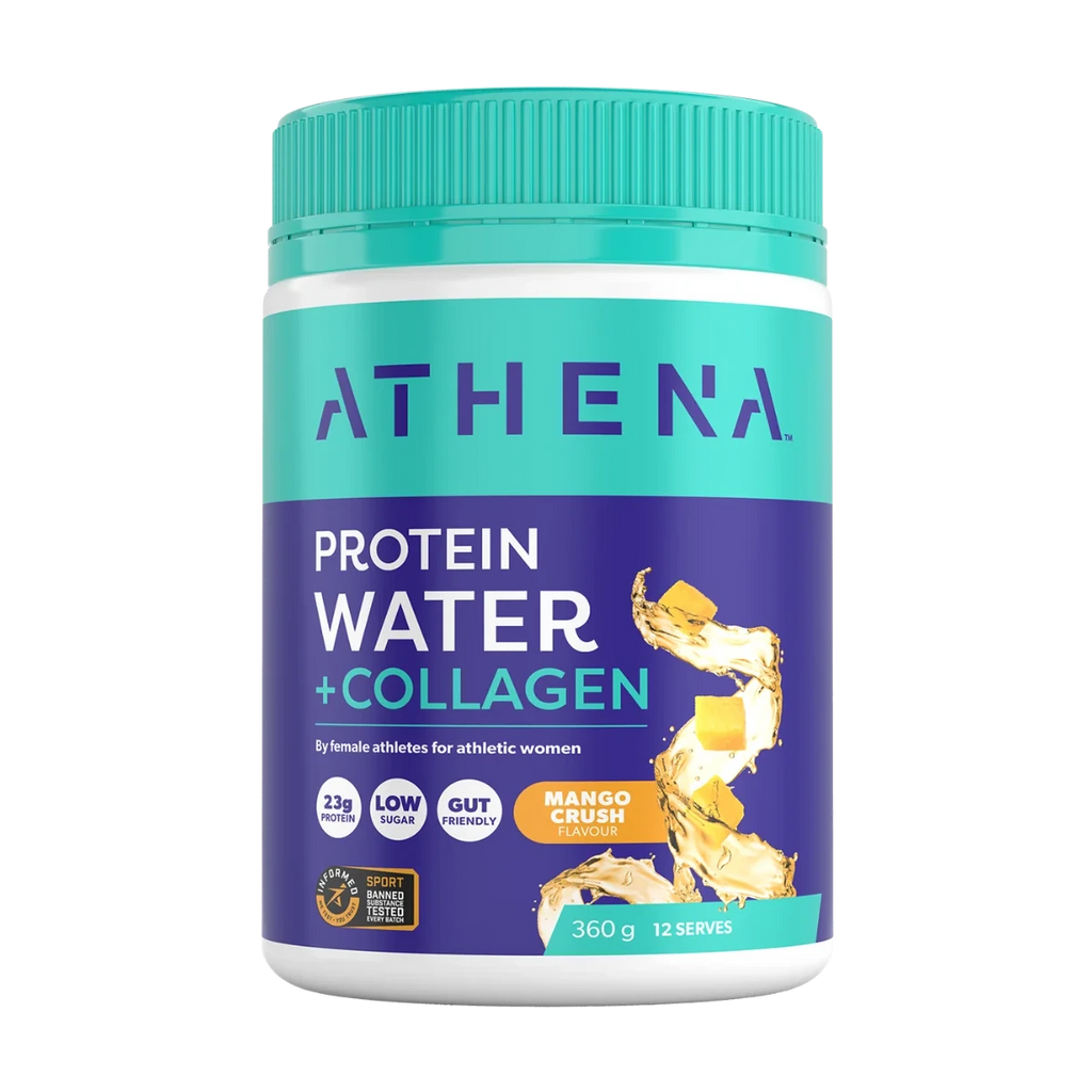 Athena Protein Water + Collagen - Mango Crush Flavour is refreshing blend of high quality Whey Protein Isolate, TENDOFORTE® Collagen and Digestive Enzymes to support your training.