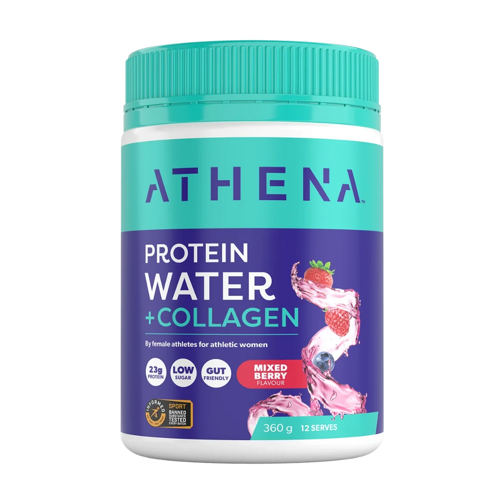Athena Protein Water + Collagen - Mixed Berry Flavour is refreshing blend of high quality Whey Protein Isolate, TENDOFORTE® Collagen and Digestive Enzymes to support your training.