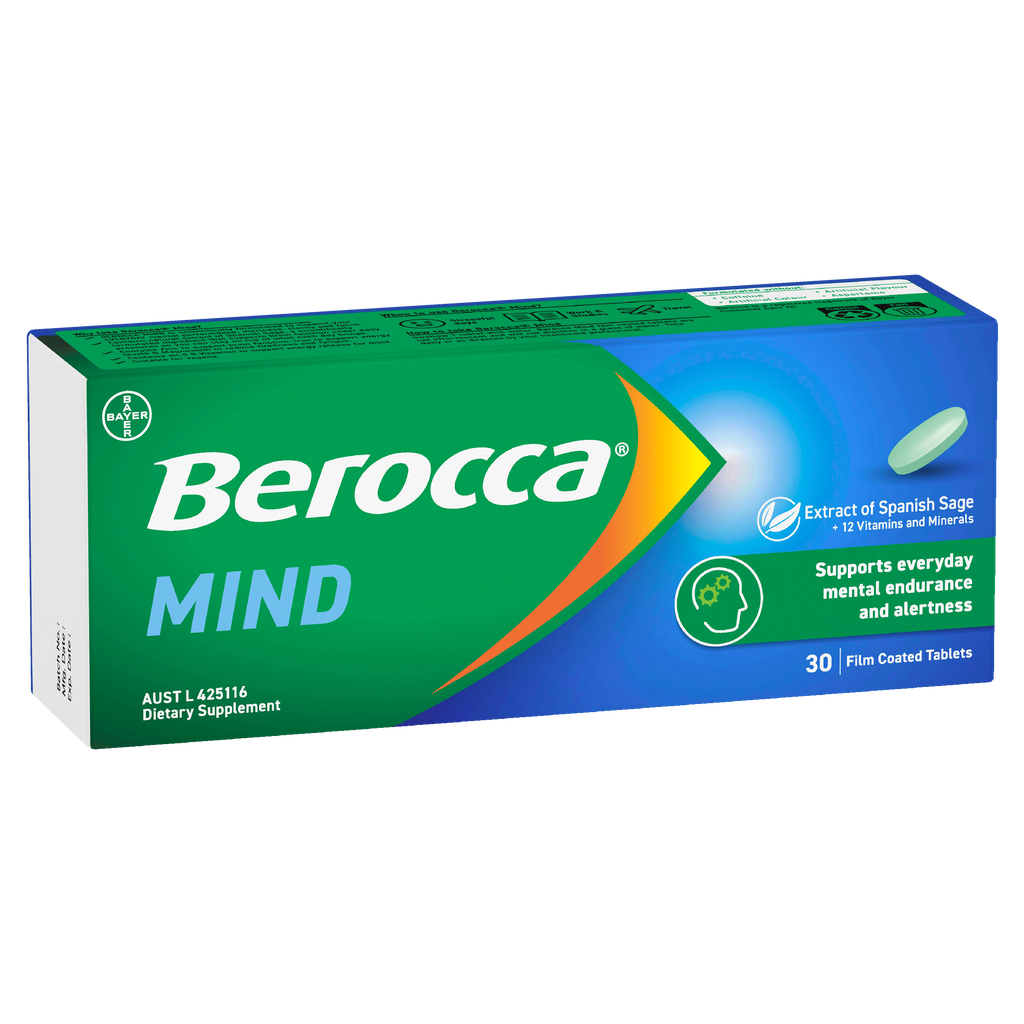 Berocca Mind Film Coated Tablet is formulated with all 8 B vitamins, vitamin C, Magnesium, Zinc, Iron and Extract of Spanish Sage to support mental performance, endurance and alertness so you can stay on top of what each day brings.