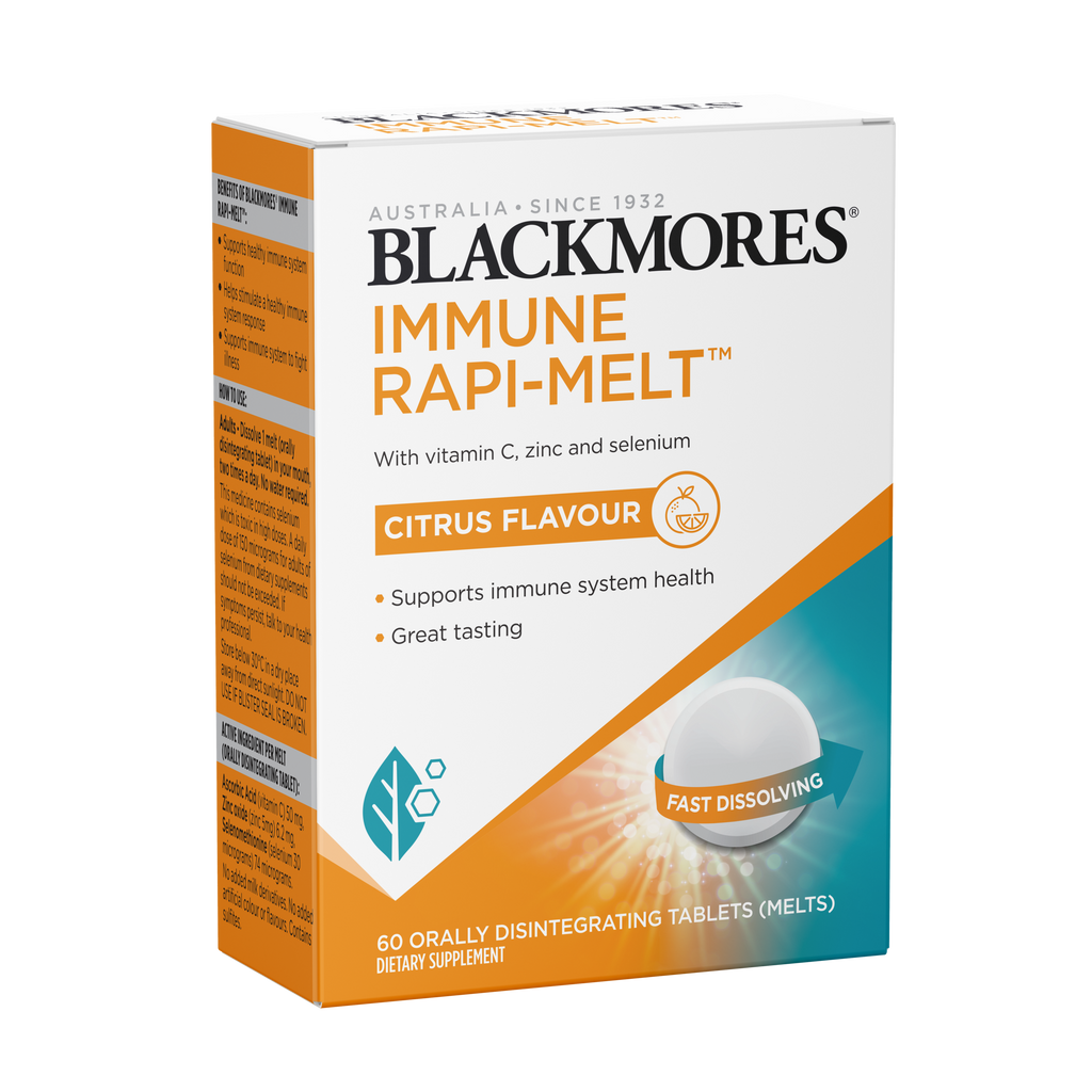 Blackmores Immune Rapi-Melt™ is a fast dissolving and great tasting citrus flavoured melt which supports immune system function. Formulated with vitamin C, zinc and selenium, in a convenient two-a-day dose.