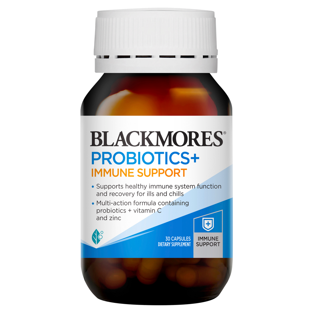 Formulated based on scientific evidence. This potent, multi-action formula Blackmores Probiotics+ Immune Support contains five scientifically studied probiotic strains providing 20 billion good bacteria, plus a prebiotic, vitamin C and zinc helping support healthy immune system function and general wellbeing.