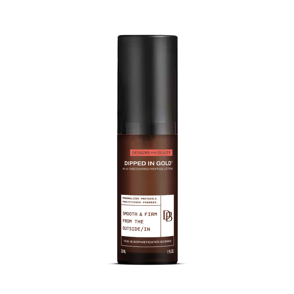 Designs for Beauty Dipped in Gold™ is a dermatologist-tested silicone-free lotion that features the first AI-discovered peptide for skincare, called PeptiYouth™, to promote healthy aging of the skin. When applied directly to the skin, Dipped in Gold™ promotes a more youthful radiance by providing nutrients such as vitamin E tocotrienols (as DeltaGold®), stabilized vitamin C, and several plant-derived compounds that support healthy collagen production and antioxidant status, which help to protect the skin from environmental stressors. Carnosine and coenzyme Q10 (as ubiquinone) are included to support optimal skin cellular metabolism and support skin firmness and elasticity.