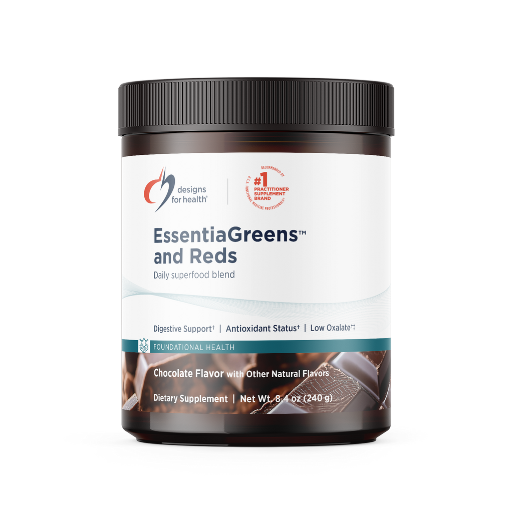 Designs for Health EssentiaGreens™ and Reds - Chocolate Flavor is a great-tasting superfood blend of greens, vegetables, and fruits designed to support nutrient status. Superfoods are nutrient-rich foods densely packed with vitamins, minerals, and phytonutrients. It features an oxygen radical absorbance capacity (ORAC) proprietary blend supporting antioxidant status, along with prebiotics to promote digestion. The ingredients have been carefully cultivated, harvested at their peak potency, and protected from environmental stressors to preserve beneficial phytonutrients. It mixes easily into beverages and is made without fillers, bulking agents, grains, legumes, alfalfa, gluten, added sugar, or artificial sweeteners. Each scoop of densely packed superfoods supports antioxidant status, sustained energy, digestive health, mental clarity, healthy immune responses, and overall well-being.