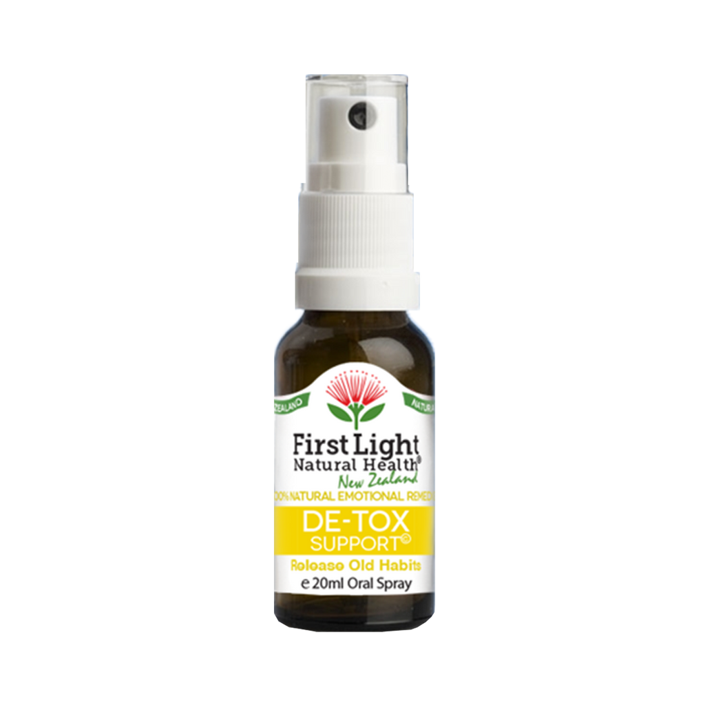 First Light Natural Health® De-Tox Support© Spray is an emotionally cleansing flower essence blend to support the natural release and elimination of old outworn habits and emotional patterns. Supports inner purity, order and wholeness. Supports you to initiate a change and apply personal will and resolution to gain positive momentum. Use when letting go of the old, when breaking a habit, fasting, dieting, detoxing or embarking on a spring clean of any kind.