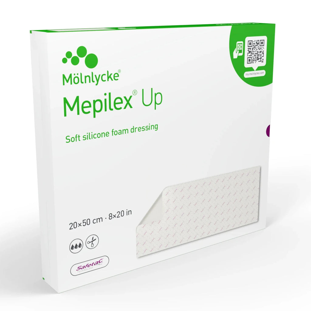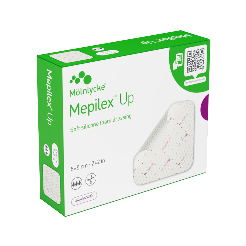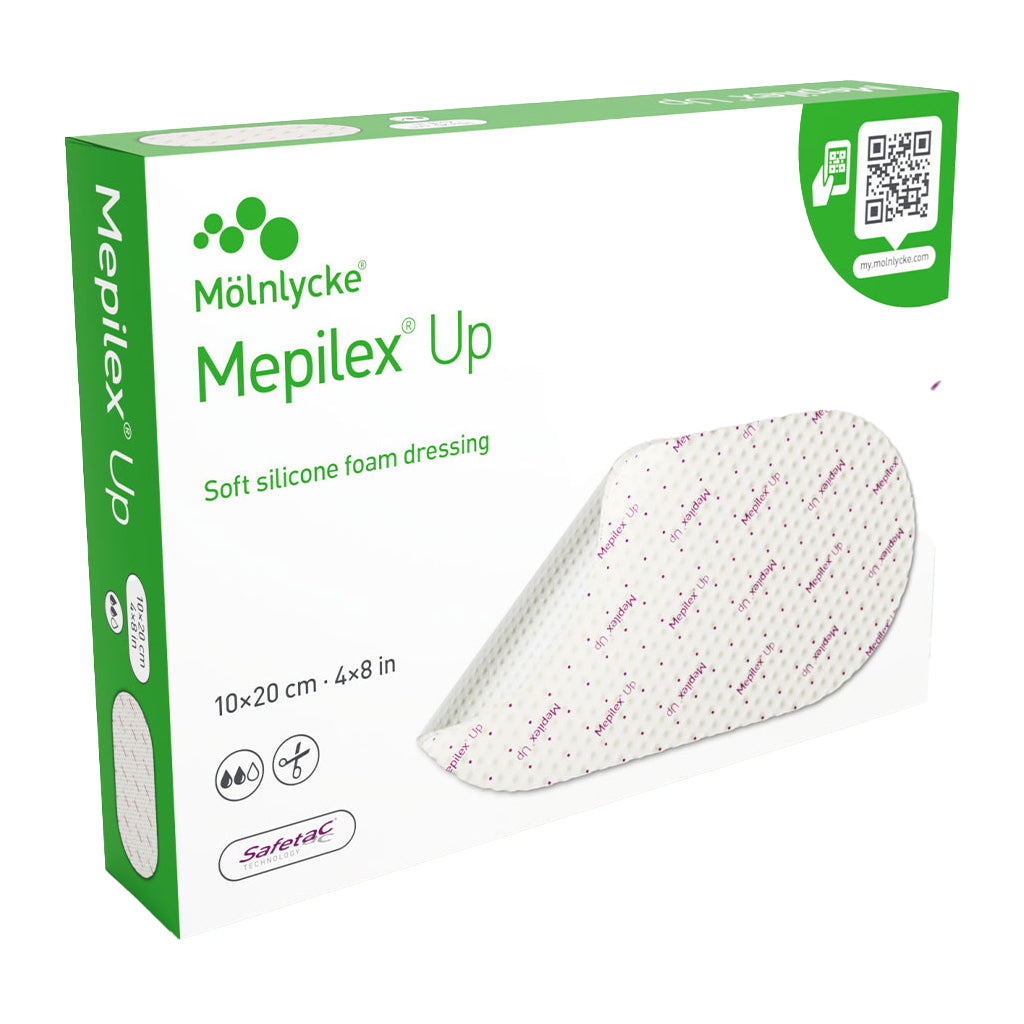 Mepilex® Up (formerly Mepilex XT) Soft Silicone Foam Dressing is a new and innovative non-bordered foam dressing designed to minimise risk of leakage. Inspired by patient needs and clinician perspectives. Despite its thinness, Mepilex Up can effectively manage high volumes of fluids thanks to its capability to evenly spread and distribute fluids in all directions within the dressing. These unique spreading properties can contribute to long wear time and fewer dressing changes.