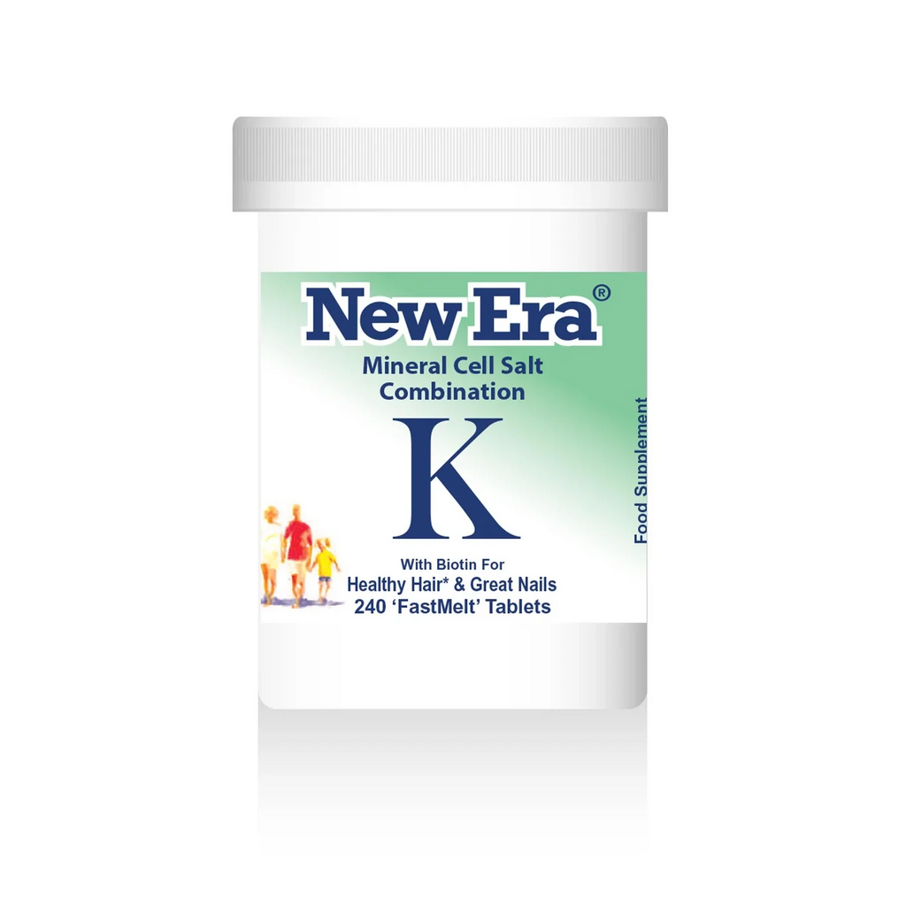 New Era Mineral Cell Salt Combination K contains Potassium Sulphate, Sodium Chloride, Silicon Dioxide. Kali. Sulph., Nat. Mur., Silica. 12 tablets provide + 13.75ug of Biotin (27.5% Reference Intake). Contributes to normal hair and nail health.