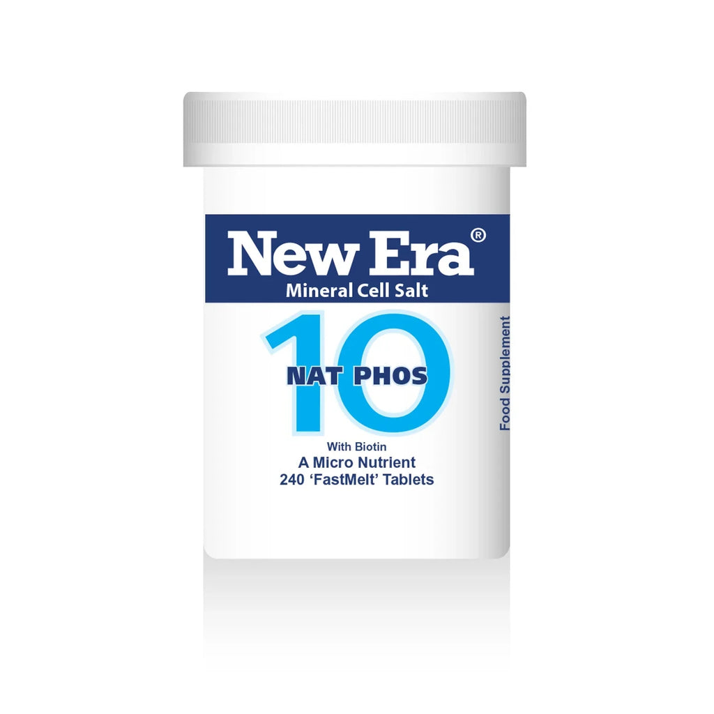 New Era single cell salt number 10 contains NAT. PHOS, Sodium Phosphate. Contains triturated (finely ground) tiny particles of cell salt in easy to take, dissolve on the tongue ‘FastMelt’ tablets with the essential nutrient biotin. These are made using processes associated with New Era for almost 90 years.