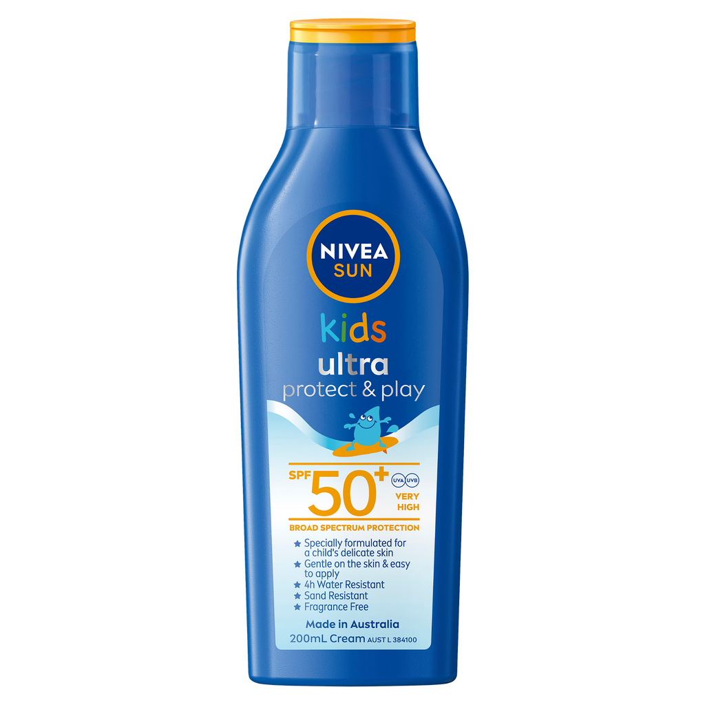 NIVEA SUN Kids Ultra Protect & Play Sunscreen Lotion SPF50+ is just what you need to protect your little ones from the harsh sun. A child’s skin is thinner than adult skin and therefore less resilient. This makes their skin particularly sensitive to harmful UVB rays causing skin to burn and UVA rays impacting long-term skin ageing. NIVEA SUN Kids Ultra Protect & Play is gentle on the skin, specifically formulated for a child’s sensitive skin, providing very high sun protection with broad spectrum UVA+UVB filters.