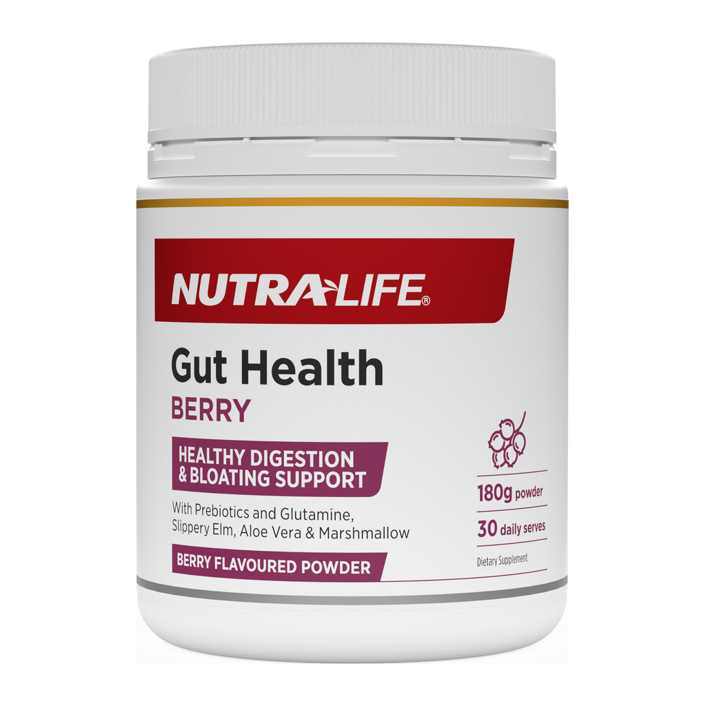 Nutra-Life Gut Health - Berry Flavour's great tasting formula combines the Prebiotics Acacia and Pectin with Glutamine, Globe Artichoke and Slippery Elm to support gut lining integrity and bloating and to help maintain a healthy digestive function. It also contains Meriva®, a patented form of Curcumin.