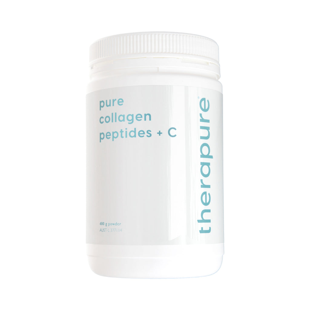 Therapure pure collagen peptides + C promotes healthy skin by supporting collagen formation and skin elasticity. It is produced from pure bovine collagen using a proprietary process to enhance absorption.