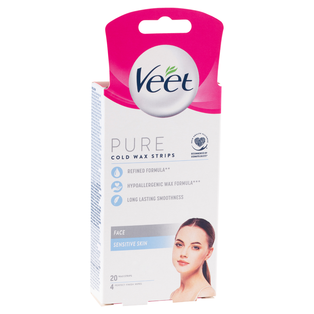 Veet Pure Face Cold Wax Strips contain a hypoallergenic wax formula** and provides long lasting smoothness in just 4 easy steps. The wax strips are specially sized to hair removal from the face.
